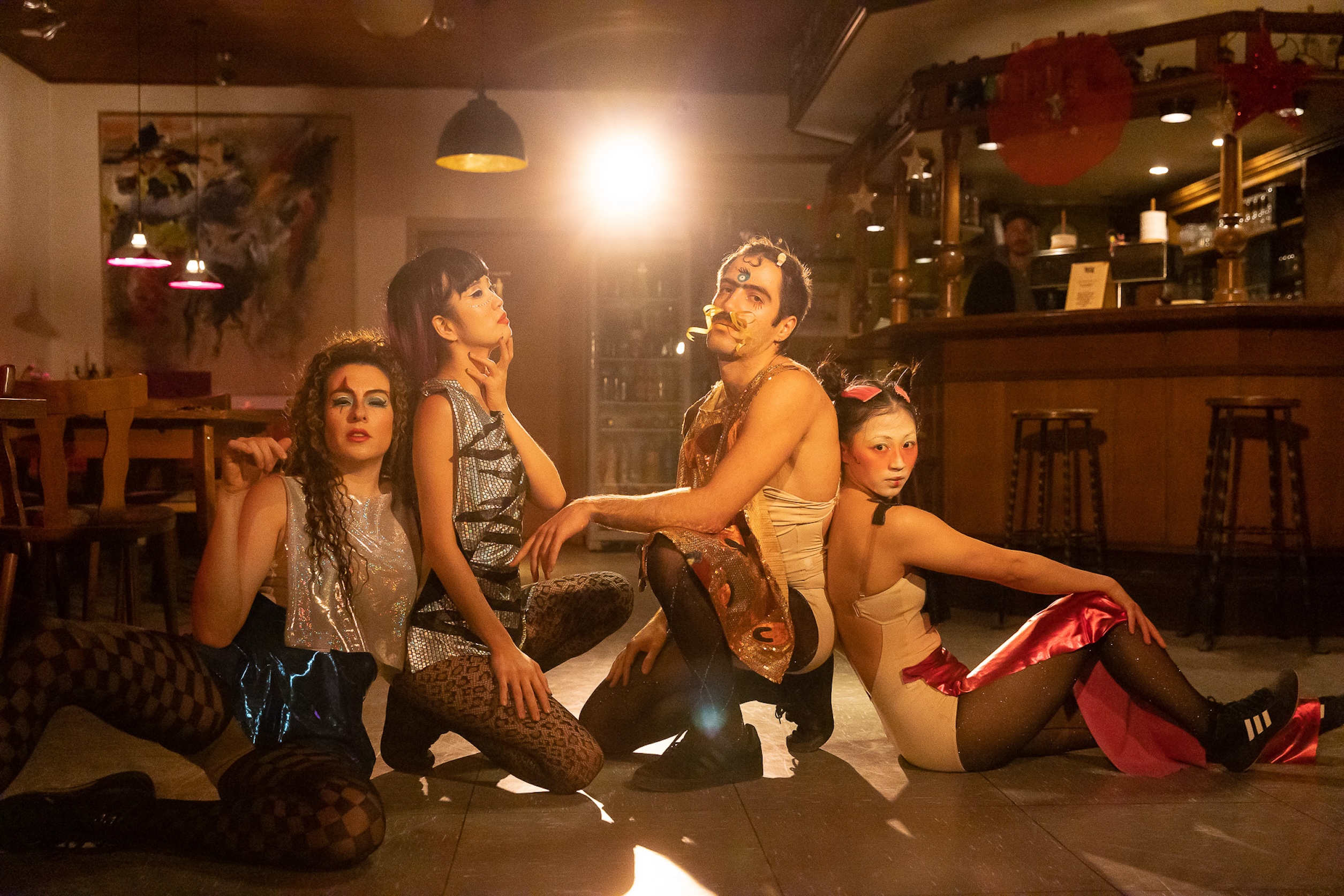 Die ursprüngliche Choreografie wurde mitten in den Raum gesetzt, Zuschauende um das Geschehen herum. Es wurde deutlich, wie stark sich die Wahrnehmung von Kunst verändern kann, wenn sich ihr Umfeld wandelt. Die Bar war nicht nur ein Ort, an dem die Grenze zwischen Bühne und Zuschauerraum aufgehoben wurde; hier begegneten sich Performer:innen und Publikum nicht allein über den Blick, sondern in einem gemeinsamen Feld geteilter Wahrnehmung. Diese neue Nähe schuf eine Atmosphäre, in der das Publikum seine eigene Präsenz aktiver entfalten konnte. Dadurch entstand eine besondere Energie, die unsere Arbeit nicht nur in ihrer Aussage, sondern auch in der gegenseitigen Erfahrung intensivierte. Wir können uns nicht mehr vorstellen, die frontale Version zu spielen, nur diese neue Adaption.